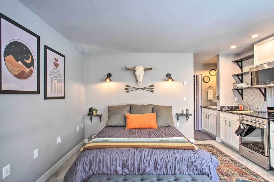 Telluride Studio in Downtown - Walk to Gondola! is gelegen in Telluride. Dit appartement biedt gratis WiFi, een tv met kabelzenders en een keuken met een koelkast en oven. Handdoeken en beddengoed worden bij het appartement verstrekt.